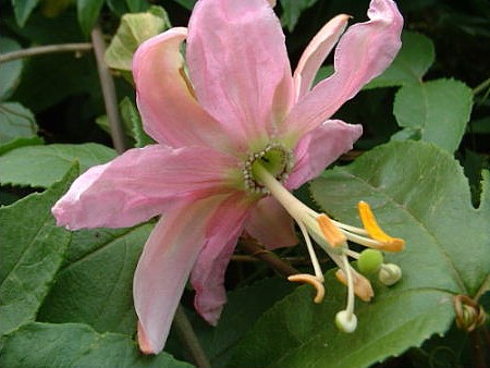 Passiflora Mollissima and its close relative Passiflora mixta are vines with cylindrical stems densely coated with yellow hairs, and are vigorous climbers, growing up to seven metres. The leaves are a shiny green with clearly defined veins, the flower is large, pink and green petalled with a yellow and white centre. The fruit is yellow-orange when ripe and contains a sweet edible orange-colored pulp with black seeds. Can be invasive ans in some countries it is illegal to handle Passiflora Mollissima as it can suffocate native species if not controlled.